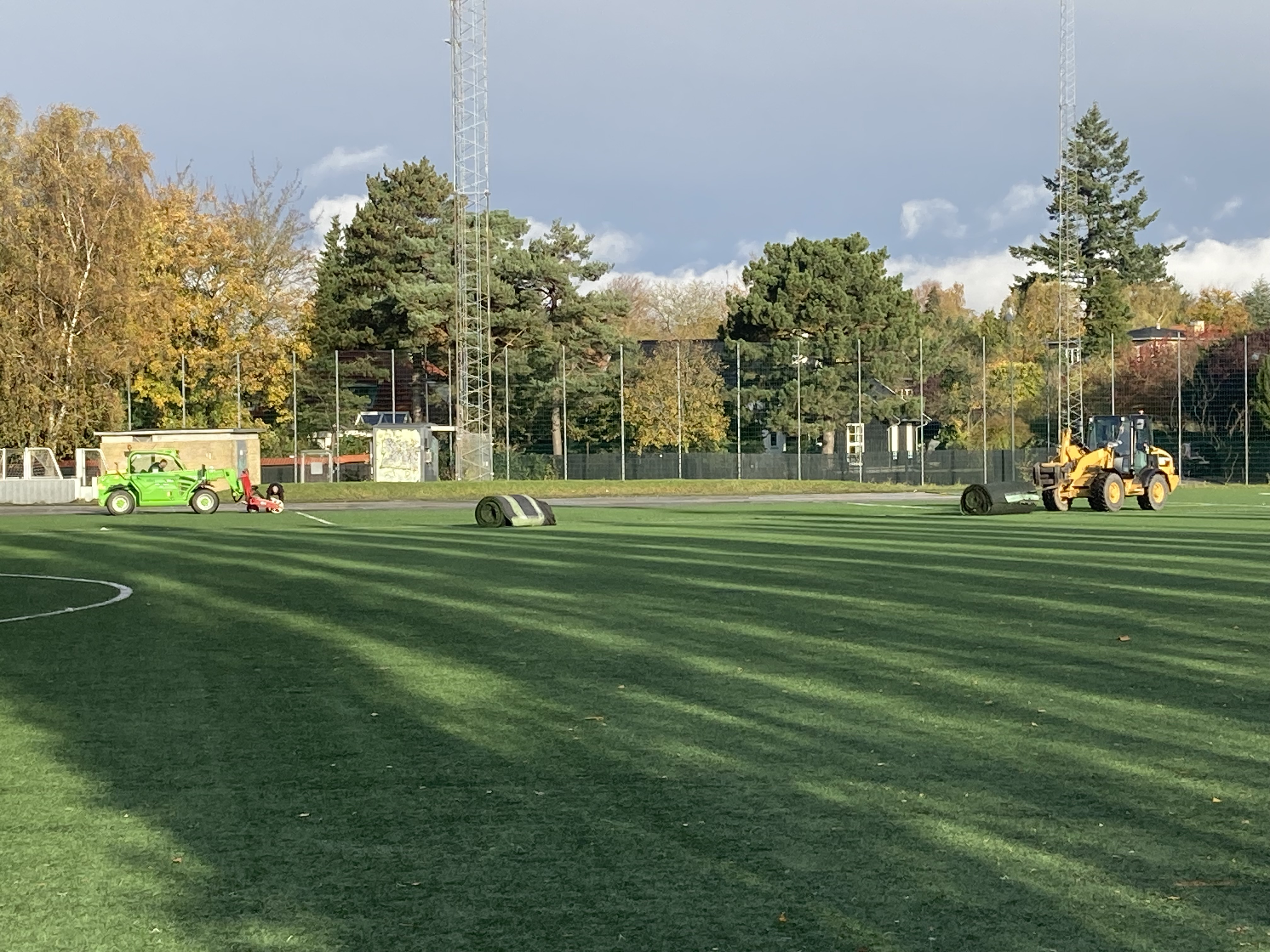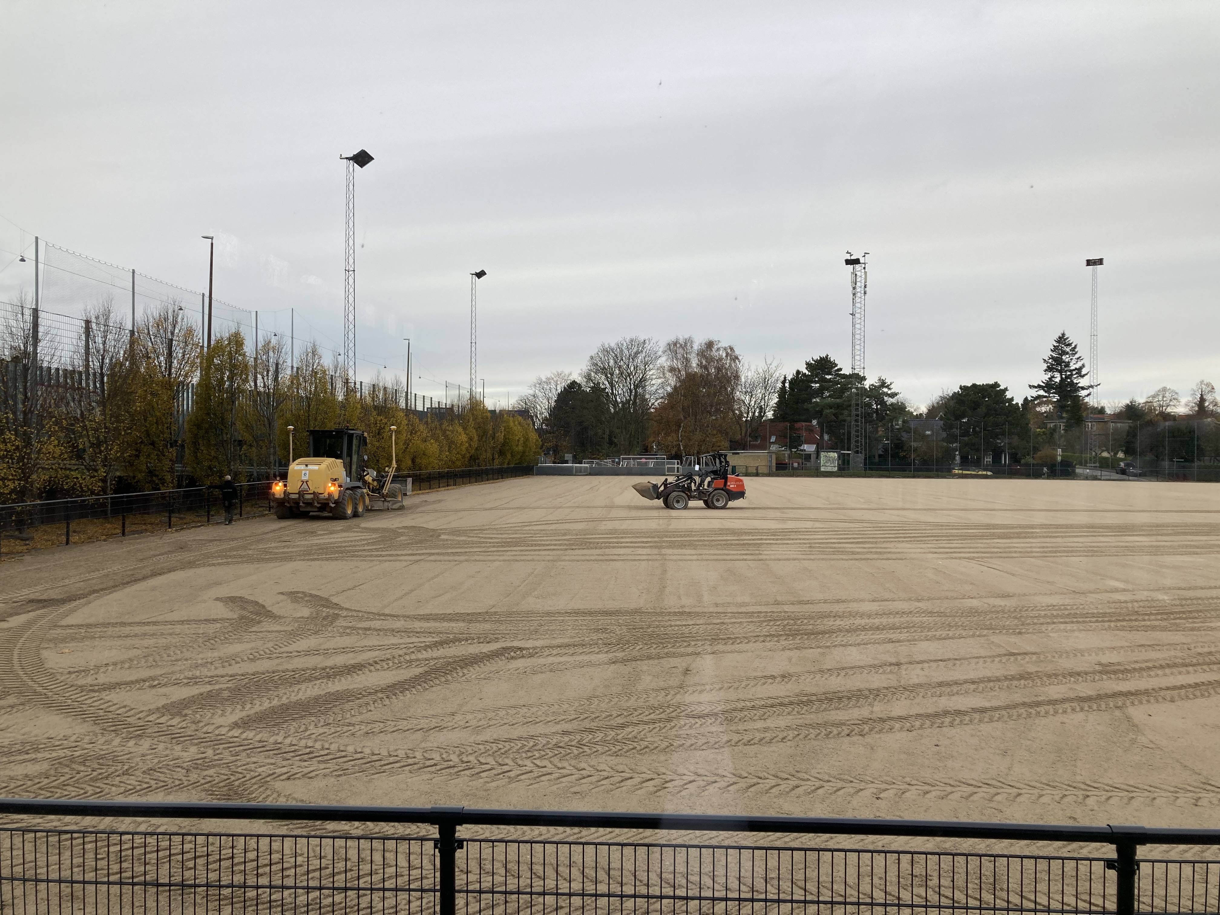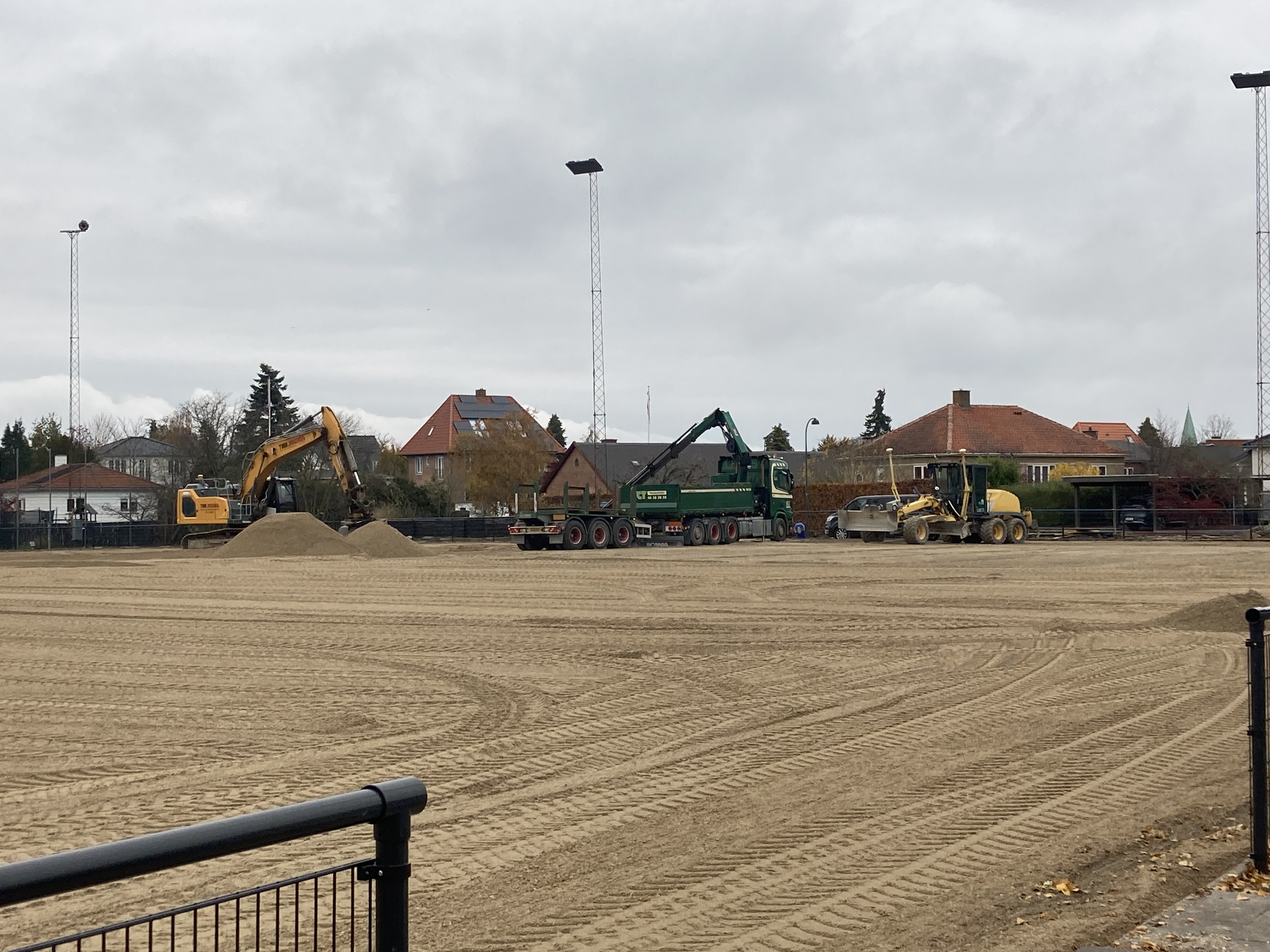 Projektet kører derudad. Trærødderne er fjernet og underlaget gjort klart til, at der på mandag startes op på at lægge selve kunstgræstæppet som planlagt efter tidsplanen. Monteringen af selve kunstgræsset er sat til at skulle foregå i uge 47 og 48. Selvom tidsplanen lige nu kører efter planen med afslutning 8. december, så er det også vigtigt at understrege, at de næste to uger også er noget af det mere "kritiske" arbejde i projektet, som kan blive påvirket af vind og vejr, som kan påvirke tidsplanen. Derfor kan det være, at vi i løbet af uge 47 allerede kan melde om mindre udsættelse af tidsplanen. Lige så snart det evt. skulle ske, så kommunikerer vi det ud.