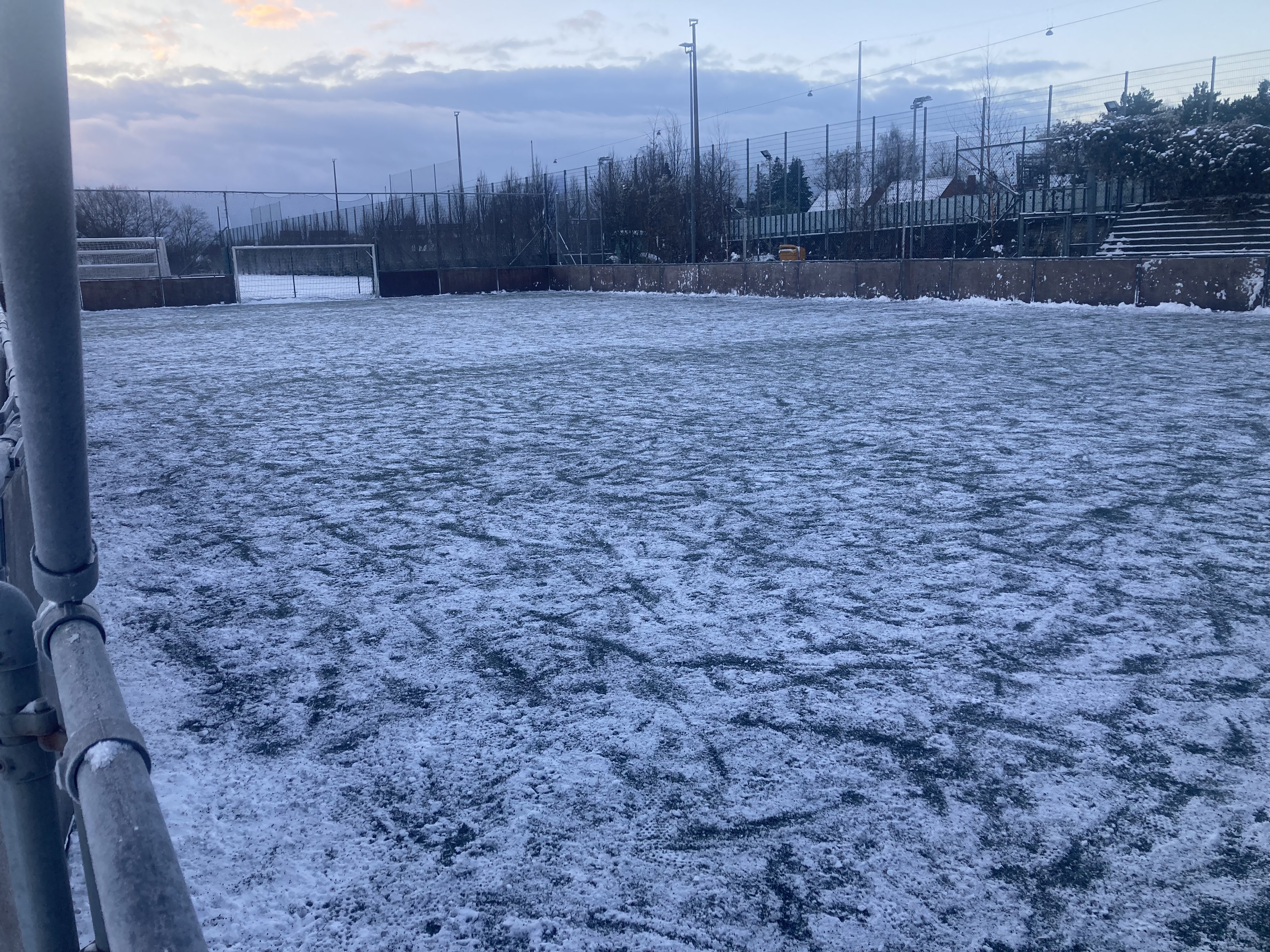 De voksenhold som har tid i aften kan ikke forvente, at sneen bliver ryddet. Og selvom sneen bliver ryddet, så er anbefaling fra B1903 også, at man er opmærksom på, at banen kan være hård og glat, da kork baner ikke er lige så modstandsdygtig overfor flere dage med frost som de gamle gummi-granulatbaner.